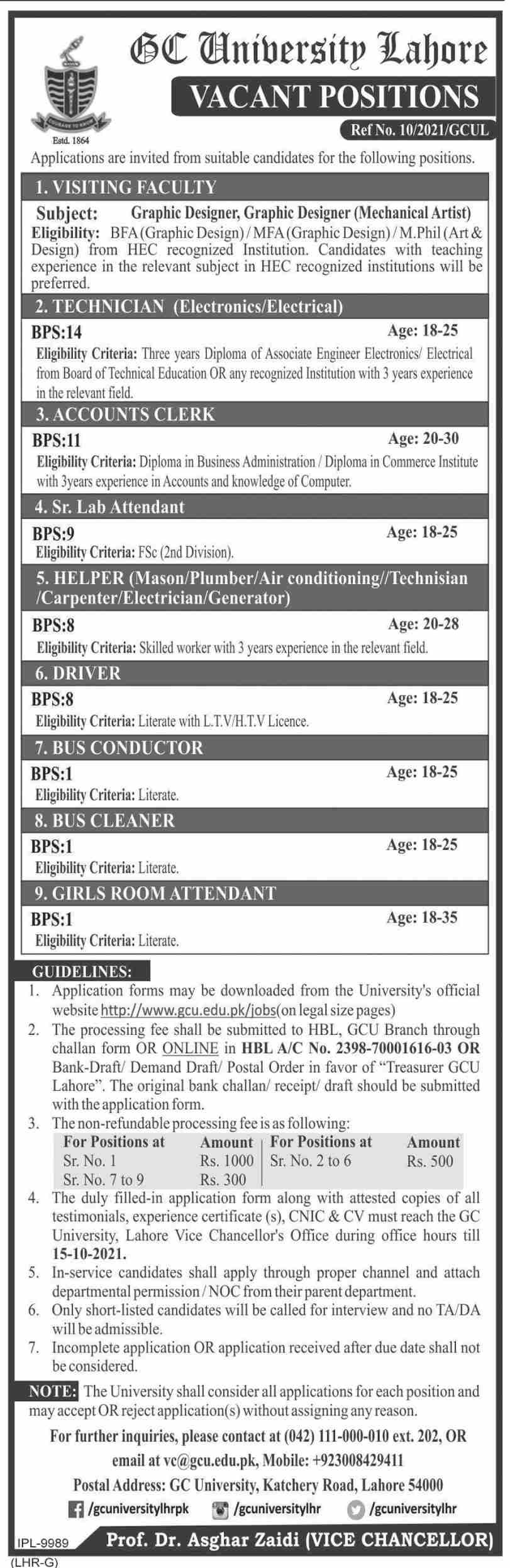 4. The duly filled-in application form along with attested copies of all testimonials, experience certificate (s), CNIC & CV must reach the GC University, Lahore Vice Chancellor's Office during office hours till 15-10-2021.