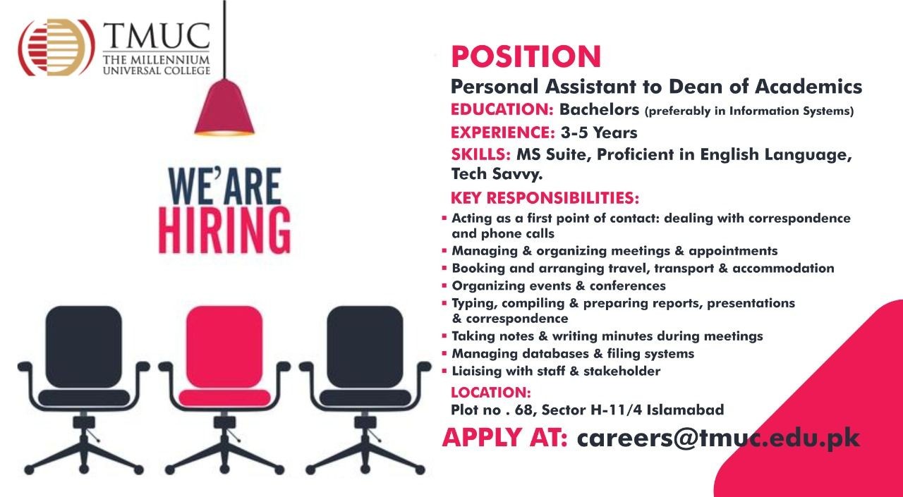 Personal Assistant to Dean of Academics EDUCATION: Bachelors (preferably in Information Systems) EXPERIENCE: 3-5 Years SKILLS: MS Suite, Proficient in English Language, Tech Savvy. KEY RESPONSIBILITIES: - Acting as a first point of contact: dealing with correspondence and phone calls ■ Managing & organizing meetings & appointments ■ Booking and arranging travel, transport & accommodation ■ Organizing events & conferences ■ Typing, compiling & preparing reports, presentations & correspondence ■ Taking notes & writing minutes during meetings • Managing databases & filing systems • Liaising with staff & stakeholder LOCATION: Plot no . 68, Sector H-11/4 Islamabad