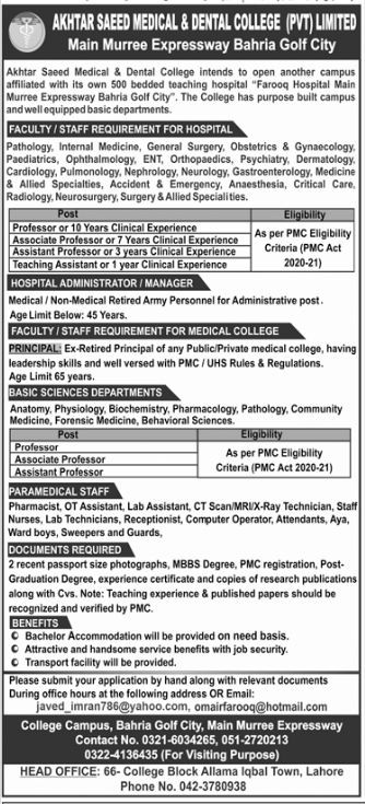Teaching/Faculty Positions, Akhtar Saeed Medical & Detnal College Jobs October 2021
