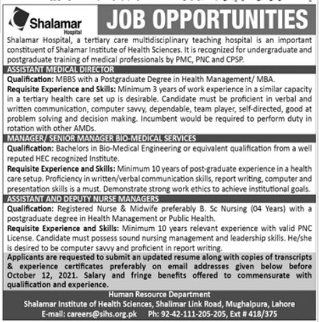 Management Positions, Shalamar Medical and Dental College Jobs October 2021