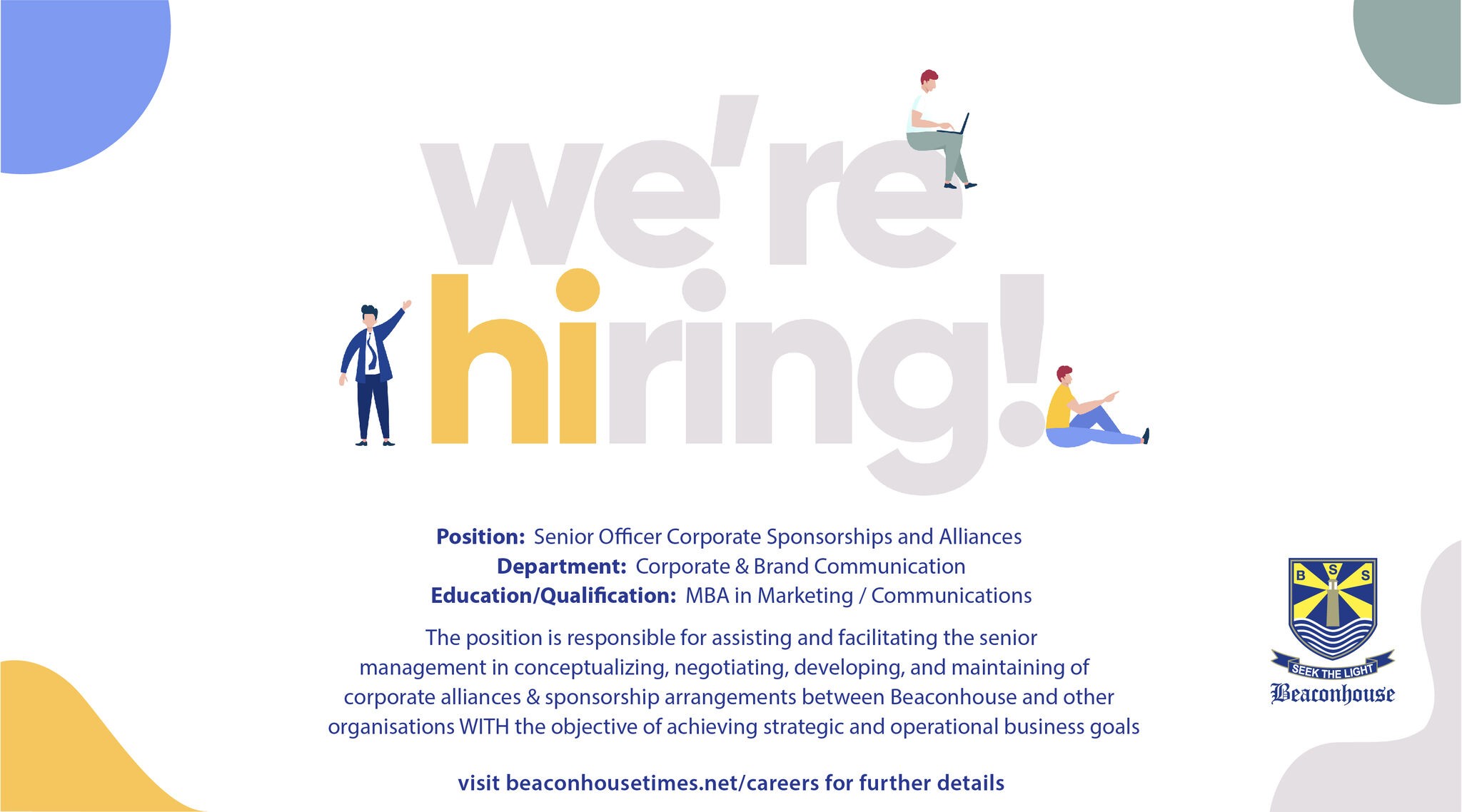 Position: Senior Officer Corporate Sponsorships and Alliances Department: Corporate & Brand Communication Education/Qualification: MBA in Marketing / Communications The position is responsible for assisting and facilitating the senior management in conceptualizing, negotiating, developing, and maintaining of corporate alliances & sponsorship arrangements between Beaconhouse and other organisations WITH the objective of achieving strategic and operational business goals