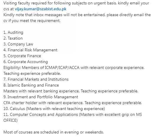 Visiting faculty required for following subjects on urgent basis. kindly email your cvs at vijay.kumar@szabist.edu.pk