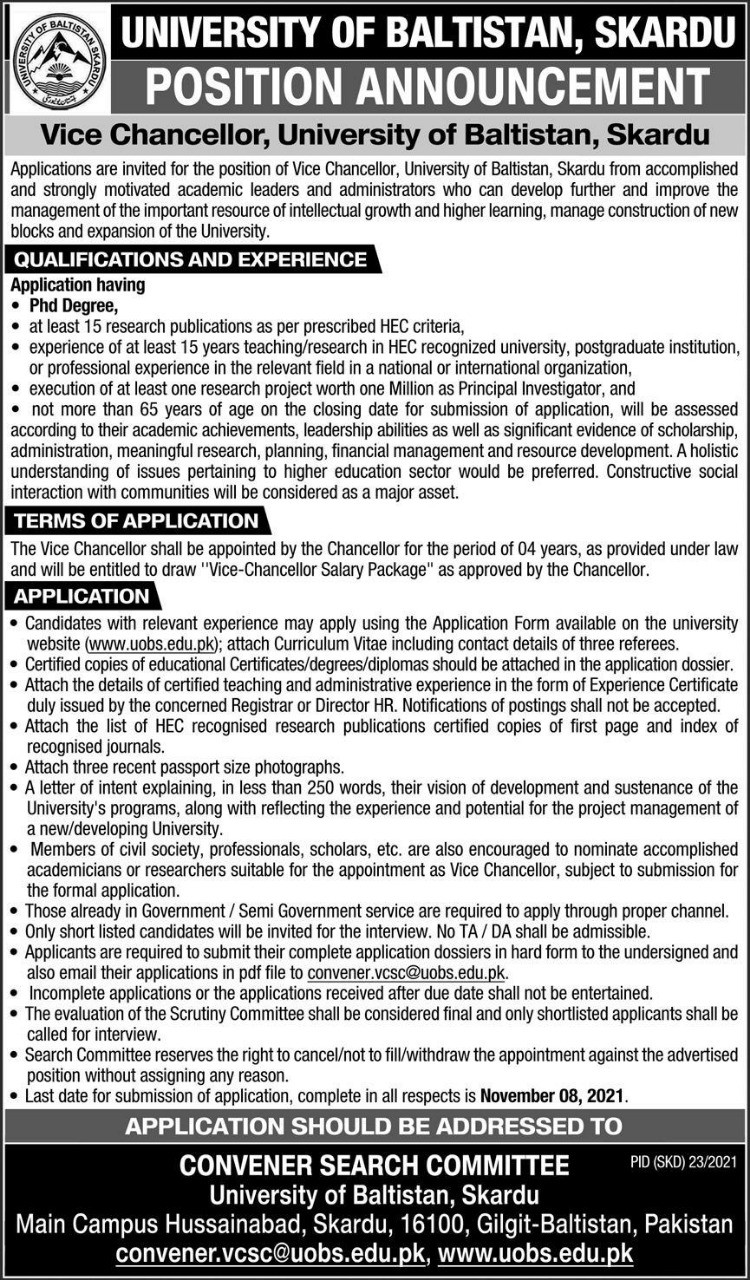 Management Positions, University of Baltistan Skardu Jobs October 2021