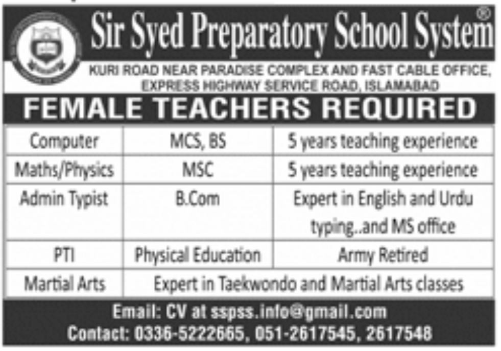 Teaching/Faculty & Management Positions, Sir Syed Preparatory School System Jobs October 2021