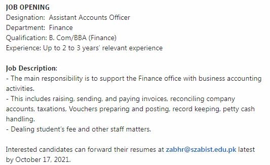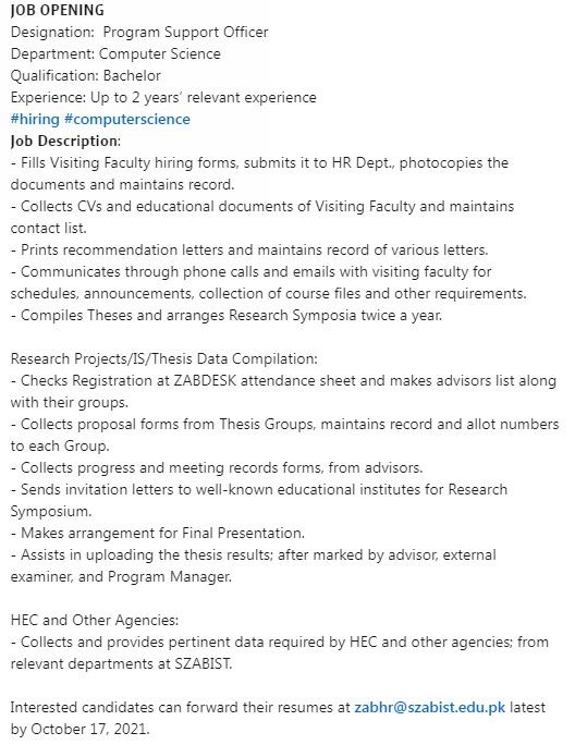 Interested candidates can forward their resumes at zabhr@szabist.edu.pk latest by October 17, 2021.