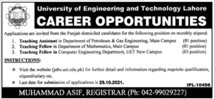 Teaching/Faculty Positions, UET Lahore Jobs October 2021