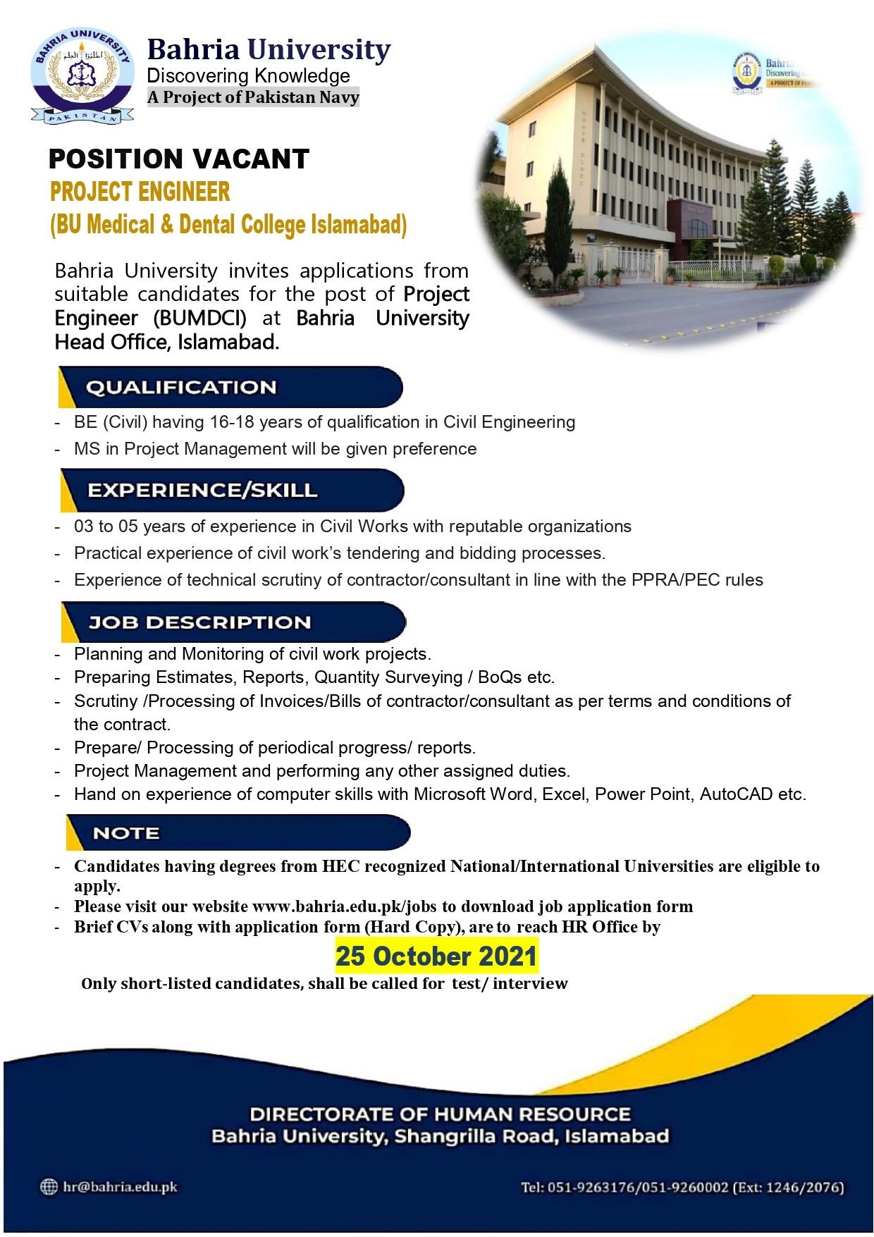 POSITION VACANT PROJECT ENGINEER (BU Medical & Dental College Islamabad) Bahria University invites applications from suitable candidates for the post of Project Engineer (BUMDCI) at Bahria University Head Office, Islamabad.