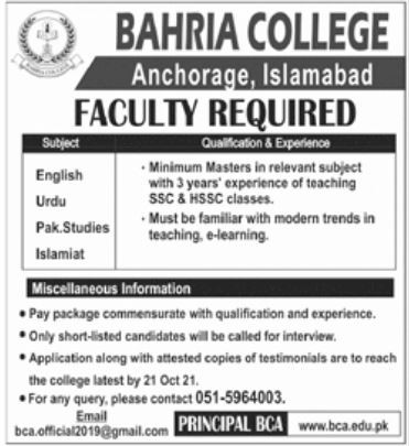• Minimum Masters In relevant subject with 1 years' expenence of leaching SSC 8 FiSSC classes • Must be familiar with modern trends in teaching e-learning