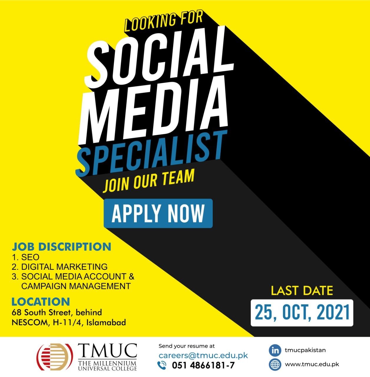 APPLY NOW: careers@tmuc.edu.pk