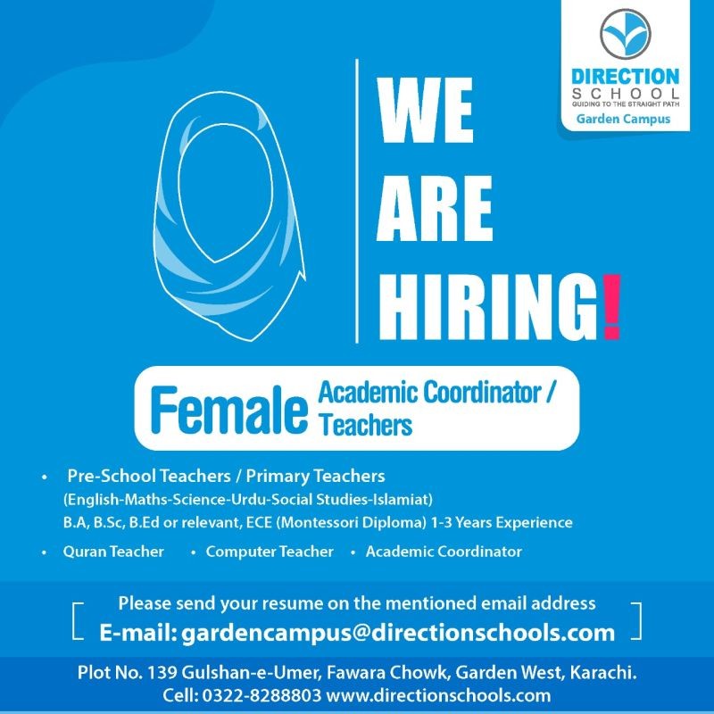 Pre-School Teachers / Primary Teachers (English-Maths-Science-Urdu-Social Studies-Islamiat) B.A, B.Sc, B.Ed or relevant, ECE (Montessori Diploma) 1-3 Years Experience