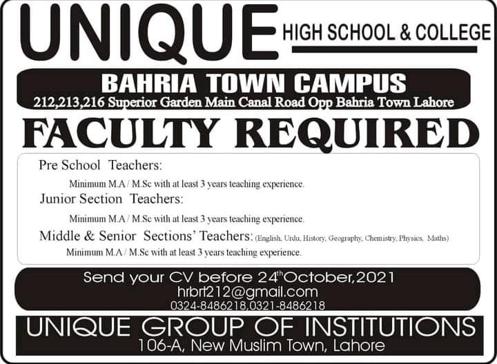 Middle & Senior Sections' Teachers Minimum M.A/ M.Sc wild at least 3 years teaching experience.