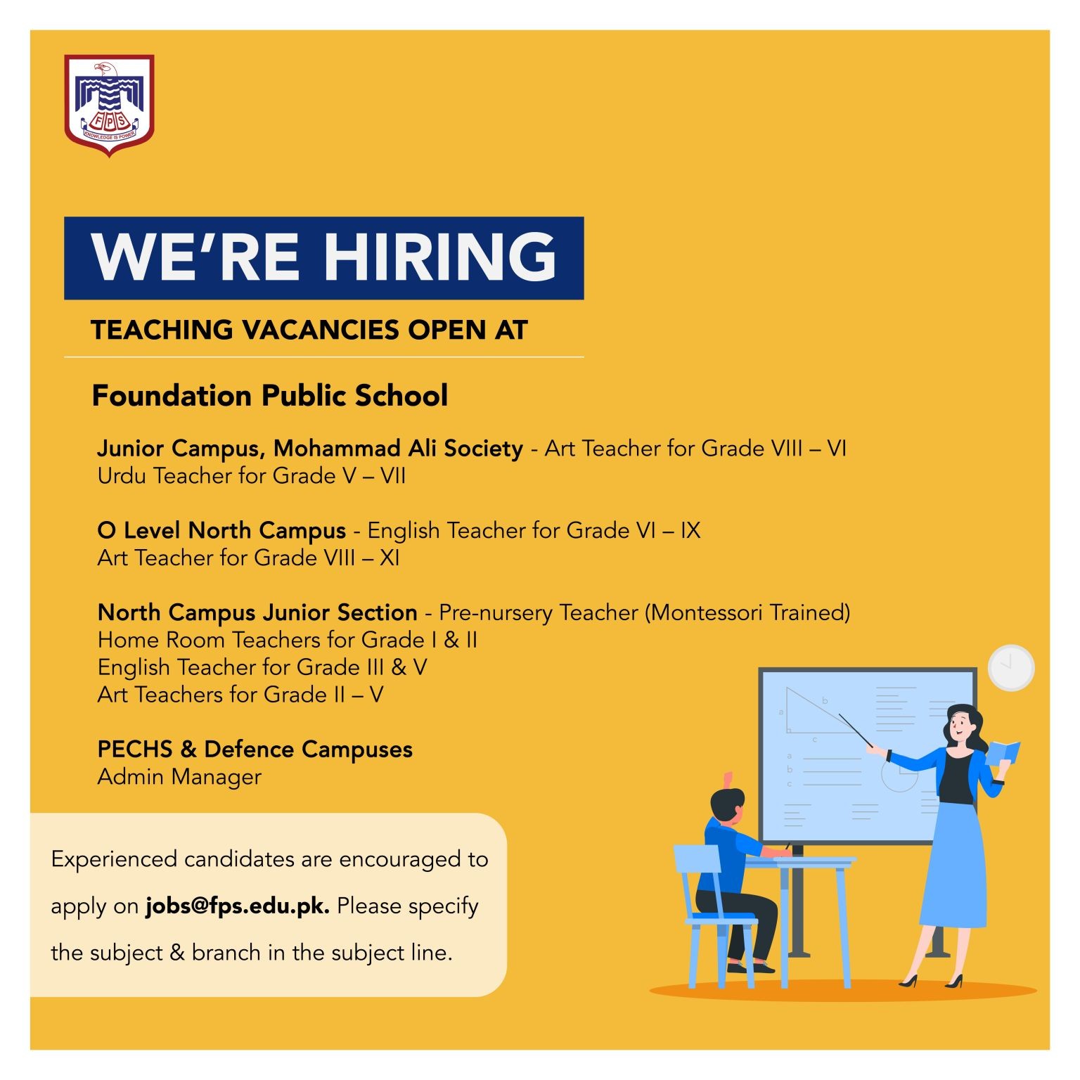 Experienced candidates are encouraged to apply on jobs@fps.edu.pk. Please specify the subject & branch in the subject line.