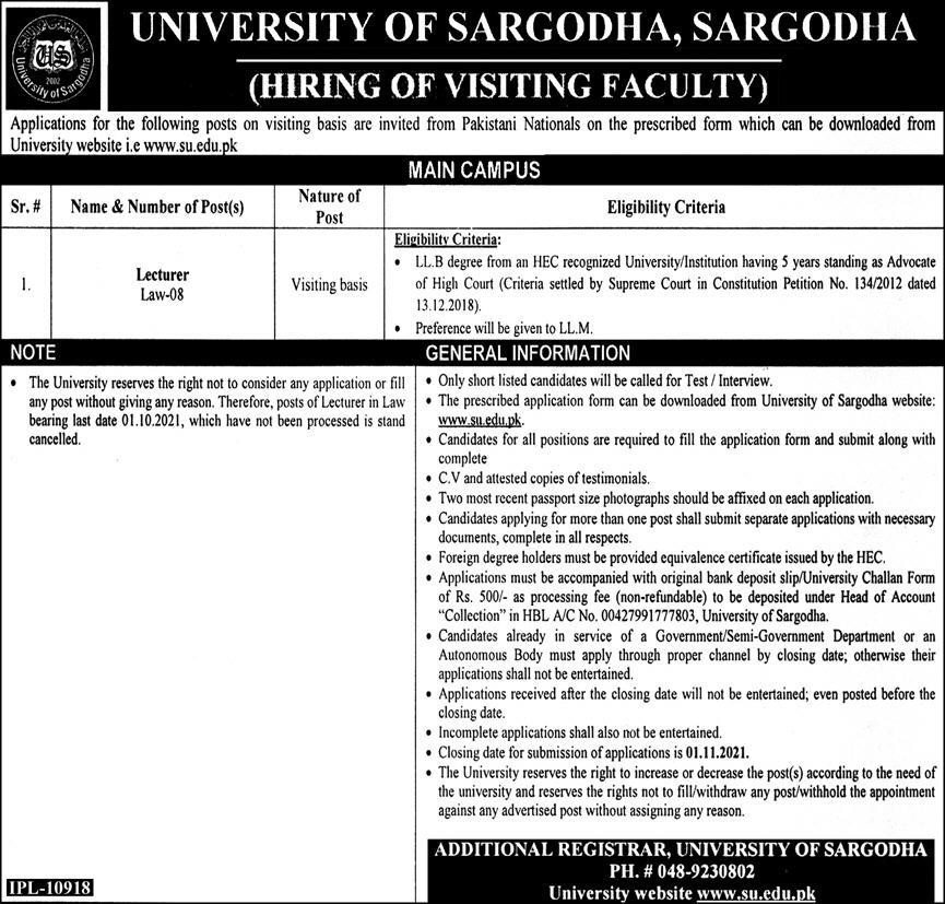 • Only short listed candidates will be called for Test / Interview. • The prescribed application form can be downloaded from University of Sargodha website: www.stteduk. • Candidates for all positions are required to fill the application form and submit along with complete • C.V and attested copies of testimonials. • Two most recent passport size photographs should be affixed on each application. • Candidates applying for more than one post shall submit separate applications with necessary documents, complete in all respects. • Foreign degree holders must be provided equivalence certificate issued by the HEC. • Applications must be accompanied with original bank deposit slip/University Challan Form of Rs. 500/- as processing fee (non-refundable) to be deposited under Head of Account "Collection" in HBL A/C No. 00427991777803, University of Sargodha. • Candidates already in service of a Government/Semi-Government Department or an Autonomous Body must apply through proper channel by closing date; otherwise their applications shall not be entertained. • Applications received after the closing date will not be entertained; even posted before the closing date. • Incomplete applications shall also not be entertained. • Closing date for submission of applications is 01.11.2021. • The University reserves the right to increase or decrease the post(s) according to the need of the university and reserves the rights not to fill/withdraw any post/withhold the appointment against any advertised post without assigning any reason.