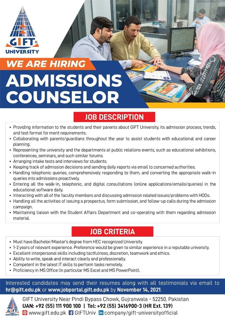 Interested candidates may send their resumes along with all testimonials via email to hr@gift.edu.pk or www.jobportal.gift.edu.pk by November 14, 2021.
