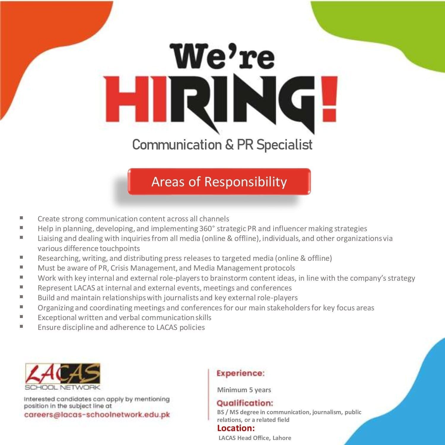 Experience: Minimum 5 years Qualification: BS / MS degree in communication, journalism, public relations, or a related field Location: LACAS Head Office, Lahore