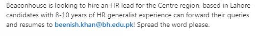 Beaconhouse is looking to hire an HR lead for the Centre region, based in Lahore - candidates with 8-10 years of HR generalist experience can forward their queries and resumes to beenish.khan@bh.edu.pk! Spread the word please.