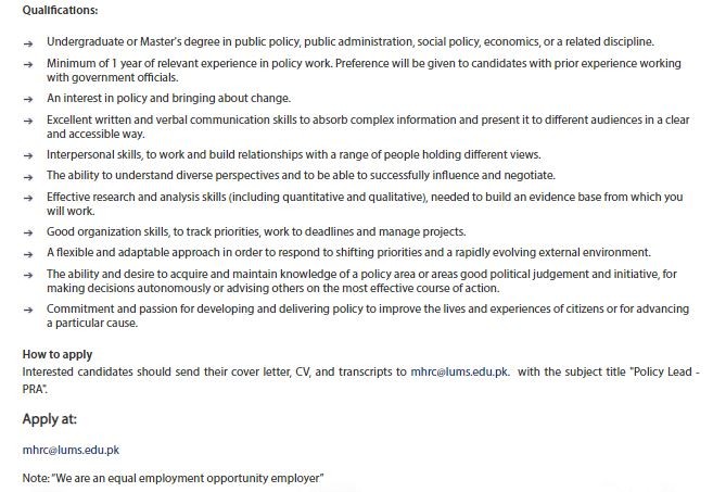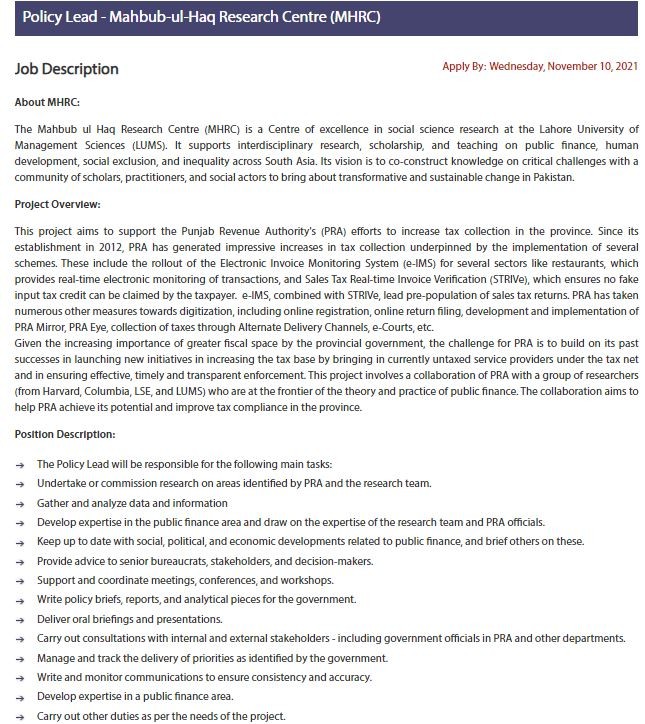 Policy Lead - Mahbub-ul-Haq Research Centre (MHRC)