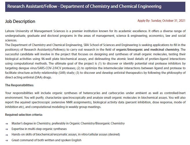 The Department of Chemistry and Chemical Engineering, SBA School of Sciences and Engineering is seeking applications to fill in the position(s) of Research Assistant(s)/Fellow(s) to carry out research in the field of organic/bioorganic and medicinal chemistry. The successful candidate will involve in the project that focuses on designing and syntheses of small organic molecules, testing their biological activities using 96-well plate biochemical assays, and delineating the atomic level details of protien-ligand interactions using computational methods. The ultimate goal of the project is (1) to discover or identify potential viral protease inhibitors by targeting dengue virus/SARS-COV-2/HCV proteases; (2) to optimize the intermolecular interactions between ligand and protease to facilitate structure-activity relationship (SAR) study; (3) to discover and develop antiviral therapeutics by following the philosophy of direct-acting antiviral (DAA) drugs.