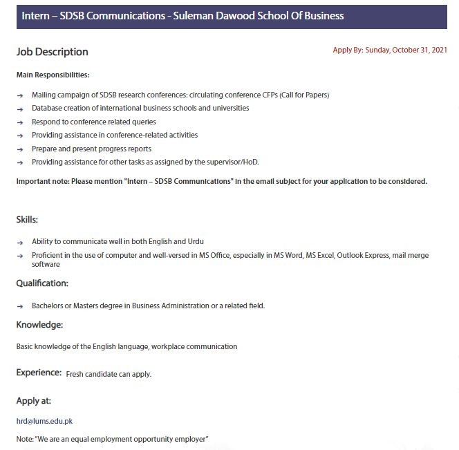 Intern – SDSB Communications - Suleman Dawood School Of Business