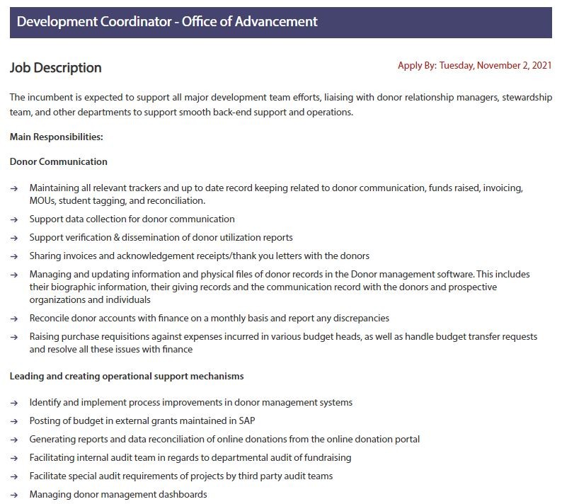 The incumbent is expected to support all major development team efforts, liaising with donor relationship managers, stewardship team, and other departments to support smooth back-end support and operations.