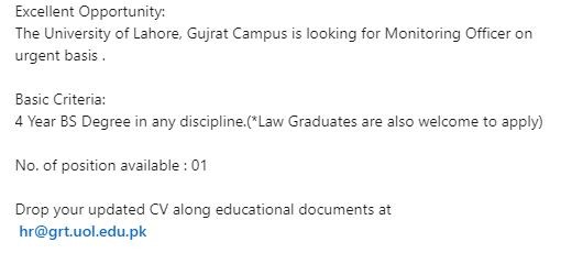 The University of Lahore, Gujrat Campus is looking for Monitoring Officer on an urgent basis.