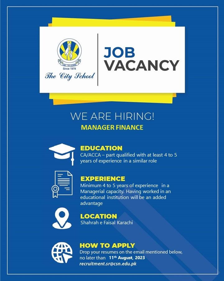 The CITY School is looking for a Manager Finance. Interested candidates fulfilling the criteria can apply at recruitment.sr@csn.edu.pk