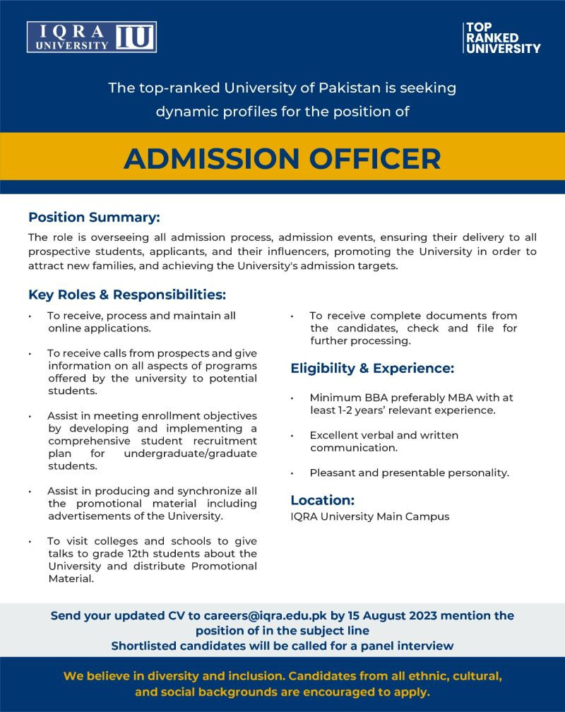 IQRA University, Karachi is looking for dynamic profiles for the "Admission Officer" position.