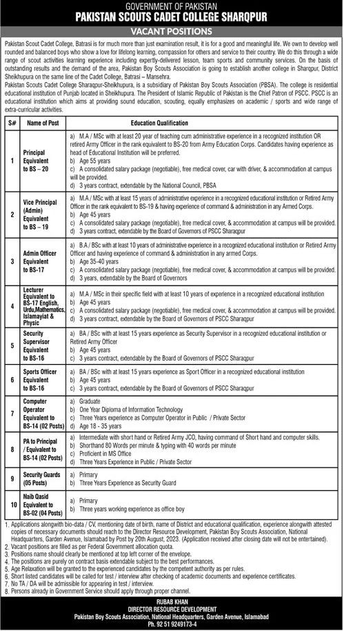 Teaching & Non-Teaching Positions at Pakistan Scouts Cadet College, Sheikhupura