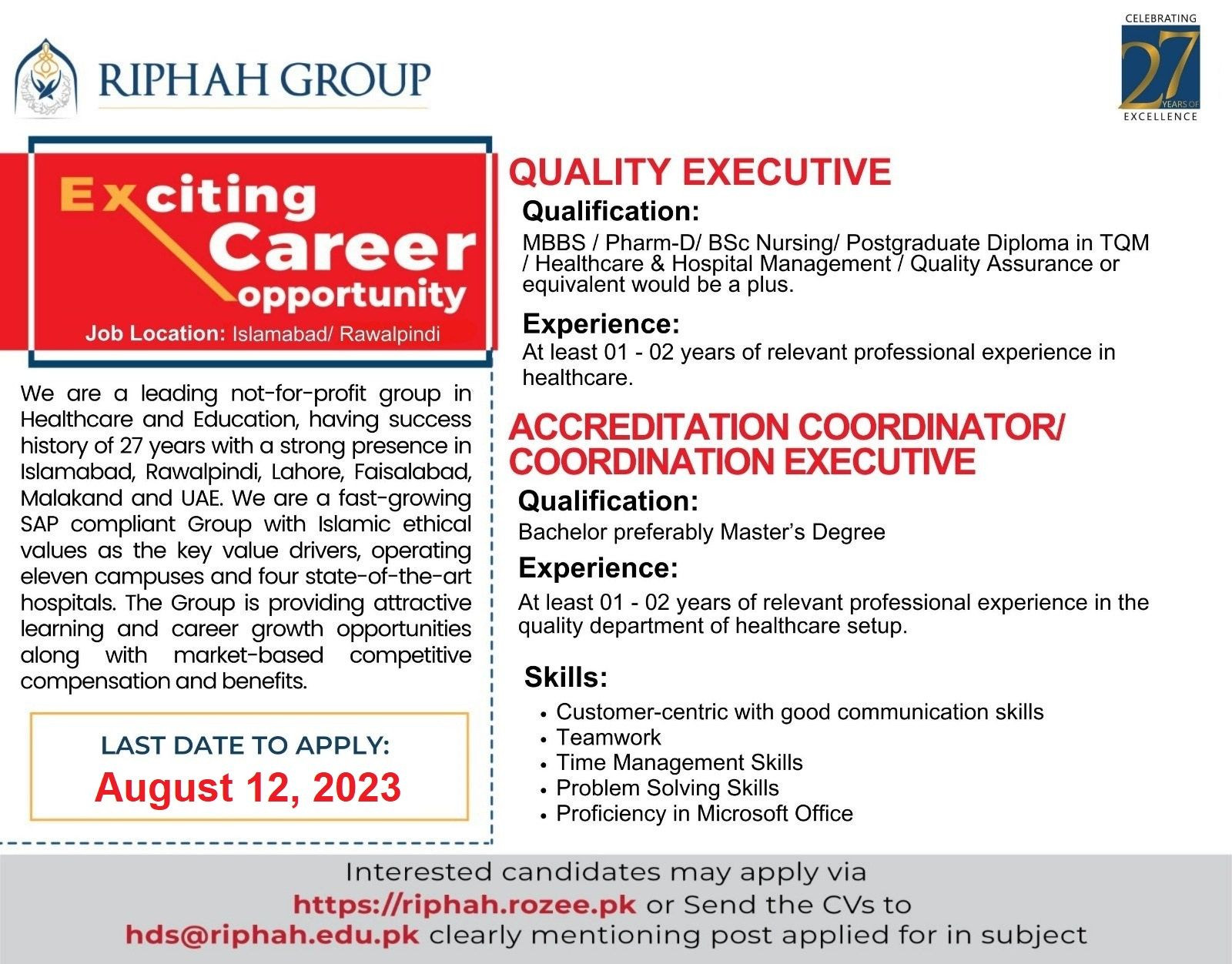 Excel in your career as Quality Executive or Accreditation Coordinator/ Coordination Executive, at Riphah Healthcare Services. We are looking for the best minds in the industry. You have got a chance to join the leading healthcare group. Interested candidates, with relevant qualification & experience, can reach us at: