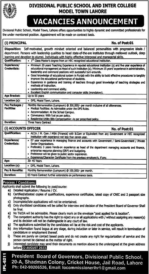 Positions Vacant at Divisional Public School and Inter College, Lahore