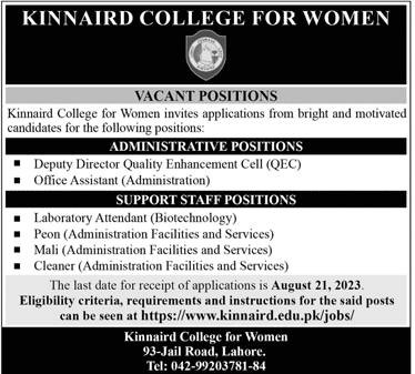 Positions Vacant at Kinnaird College for Women, Lahore