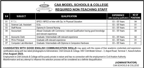 Positions Vacant at CAA Schools and College, Karachi