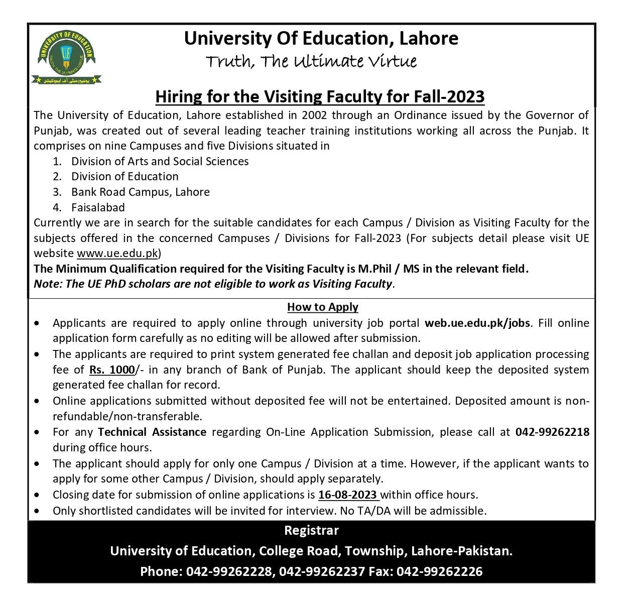 Visiting Faculty Required at University of Education