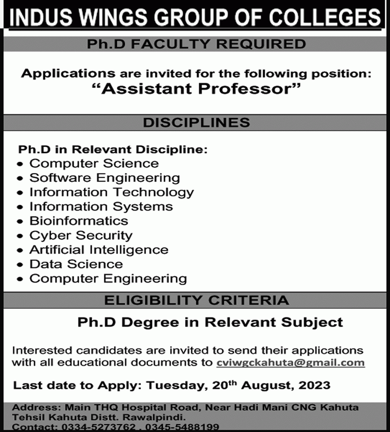 Positions Vacant at Indus Wings Group of Colleges, Kahuta