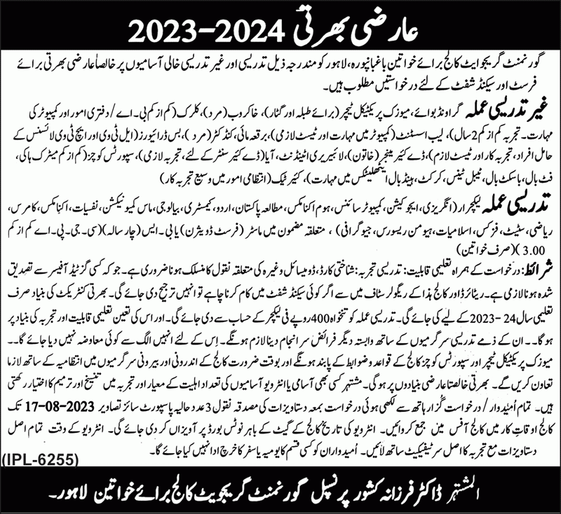 Teaching and Non-Teaching Positions at Government Graduate College for Women Baghbanpura, Lahore