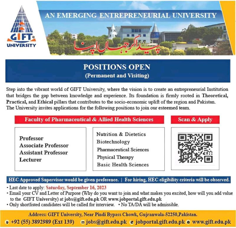 Positions Open (Permanent & Visiting) at GIFT University, Gujranwala