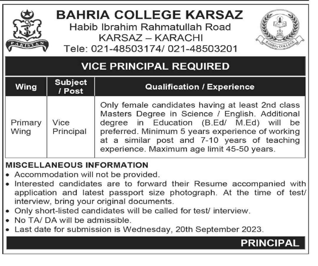 Position Vacant at BAHRIA COLLEGE,Karachi