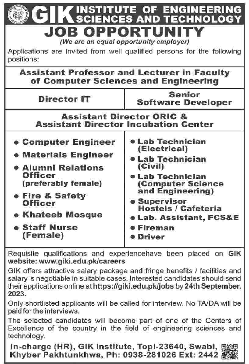 Positions Vacant at Ghulam Ishaq Khan Institute of Engineering Sciences and Technology,Swabi