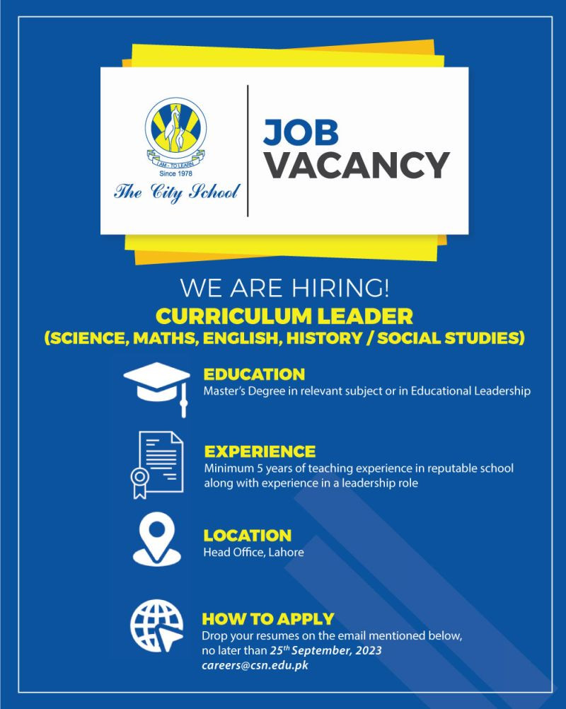 #TheCitySchool is looking to fill the position of Curriculum Leader (Science, Maths, English, History / Social Studies) at their head office in Lahore.