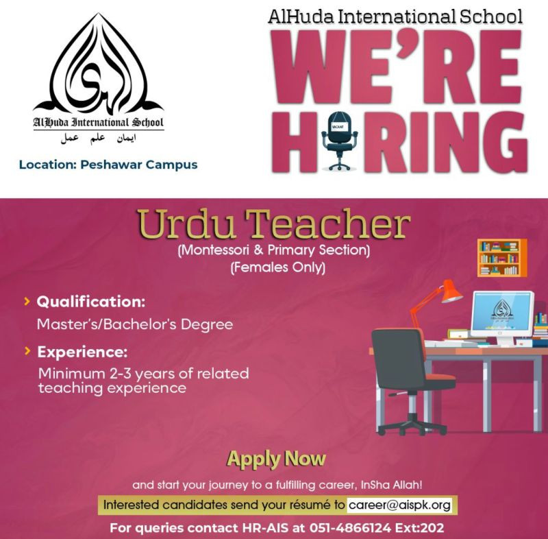 and start your journey to a fulfilling career, Insha Allah! Interested candidates send your résumé to career@aispk.org For queries contact HR-AIS at 051-4866124 Ext:202