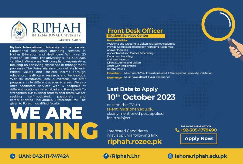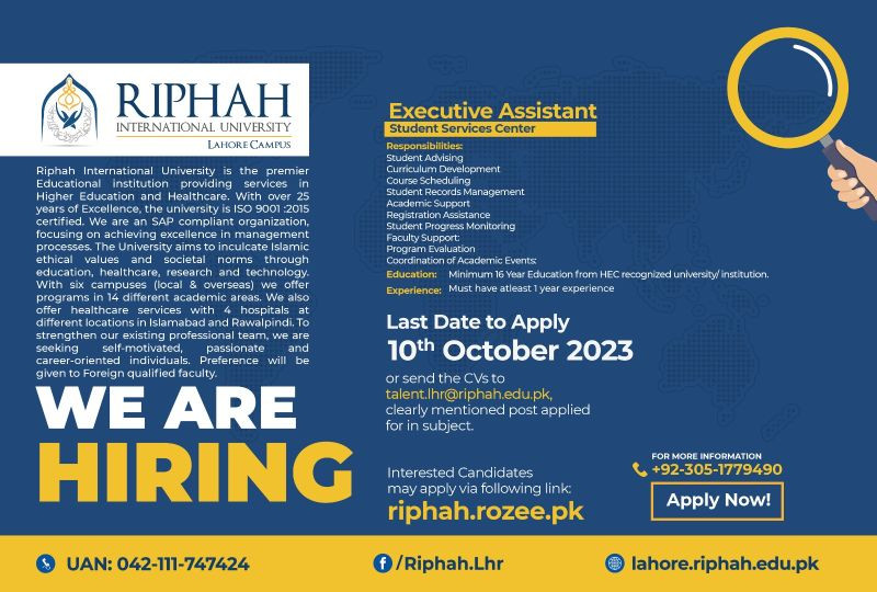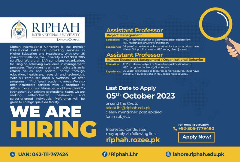 Riphah International University is hiring for Lahore Campus - Apply Now