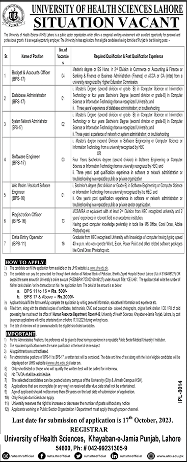 Situation Vacant AT University of Health Science (UHS) Lahore - Apply Now