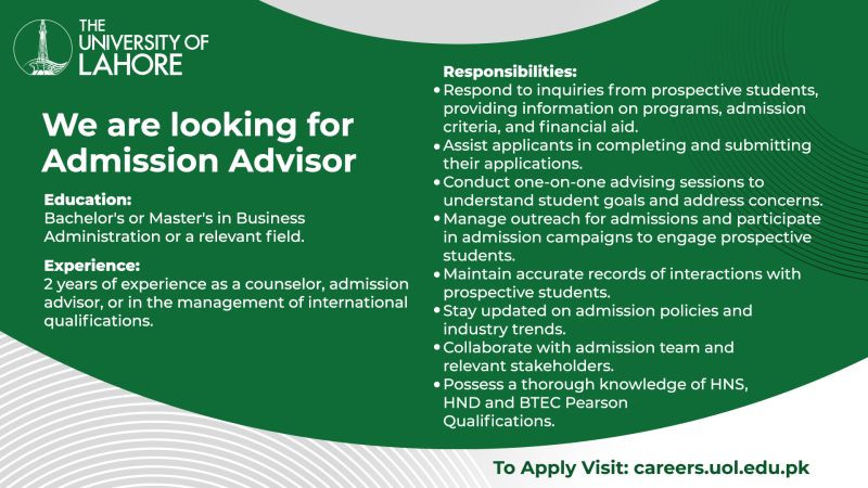Join our team at the University of Lahore as an Admission Advisor! If you are passionate about helping students achieve their educational goals and have excellent communication skills, we want to hear from you.