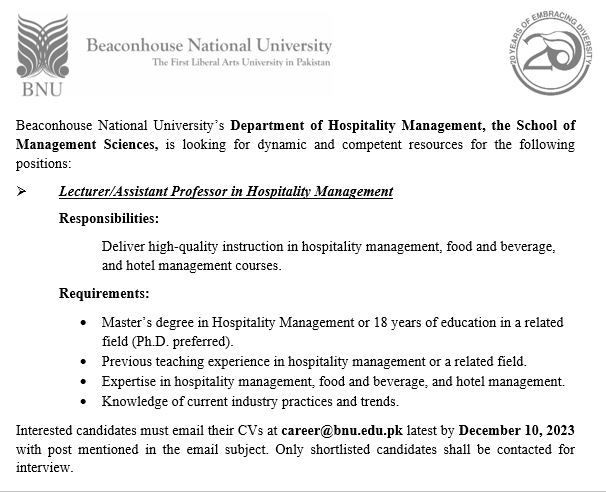 Lecturer and Assistant Professor Jobs at Beaconhouse National University (BNU)