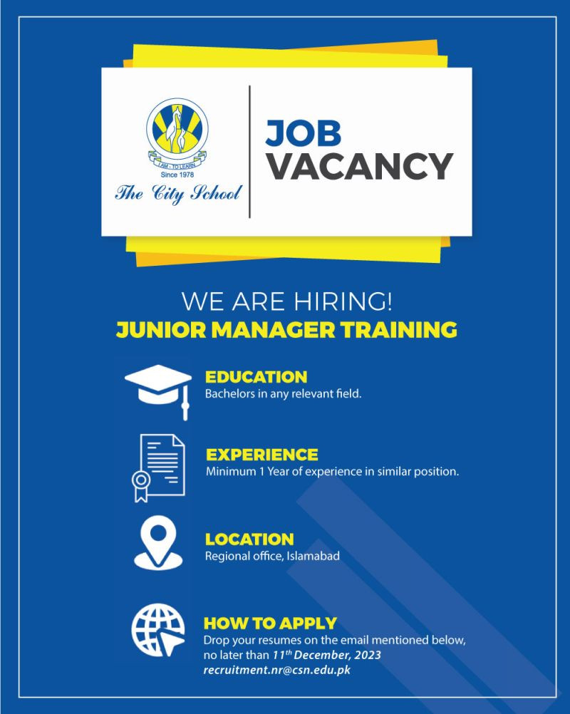 - We are looking for an experienced and professional Junior Manager Training for our Regional office in Islamabad with fresh or 1 year of experience.
