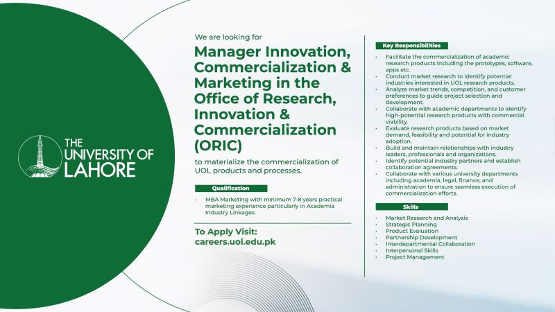 Join the University of Lahore's Office of Research, Innovation & Commercialization (ORIC) as a Manager of Innovation, Commercialization & Marketing.