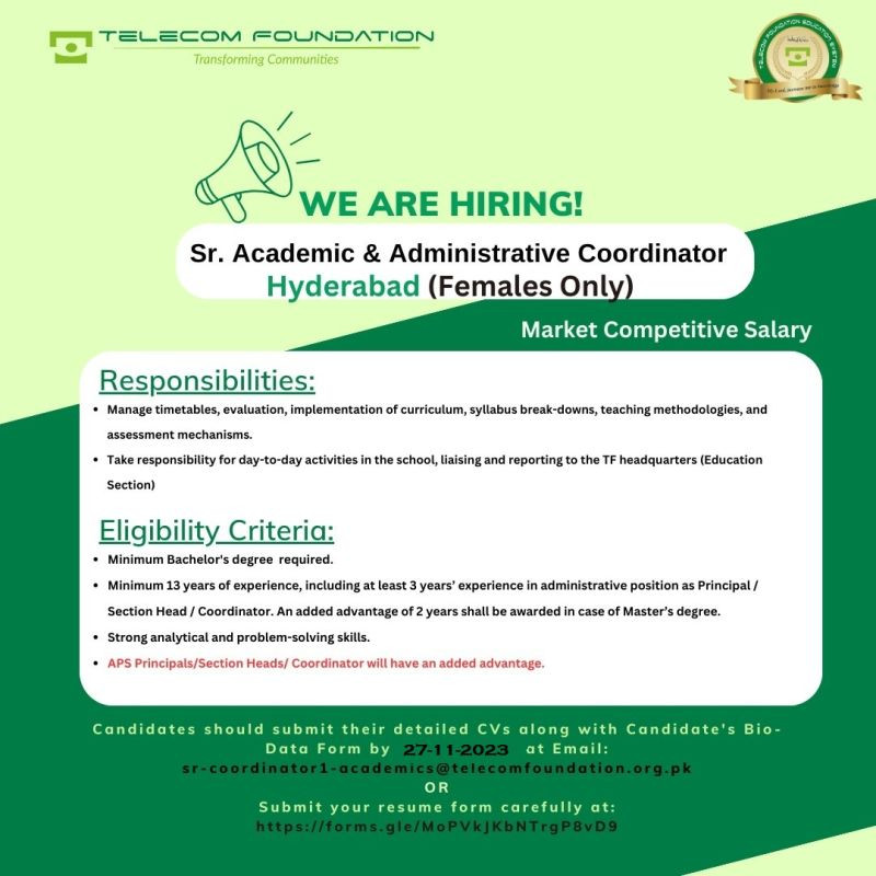 Talented Senior Academics and Administrative Coordinator is required in Telecom Foundation Education System Hyderabad Campus.