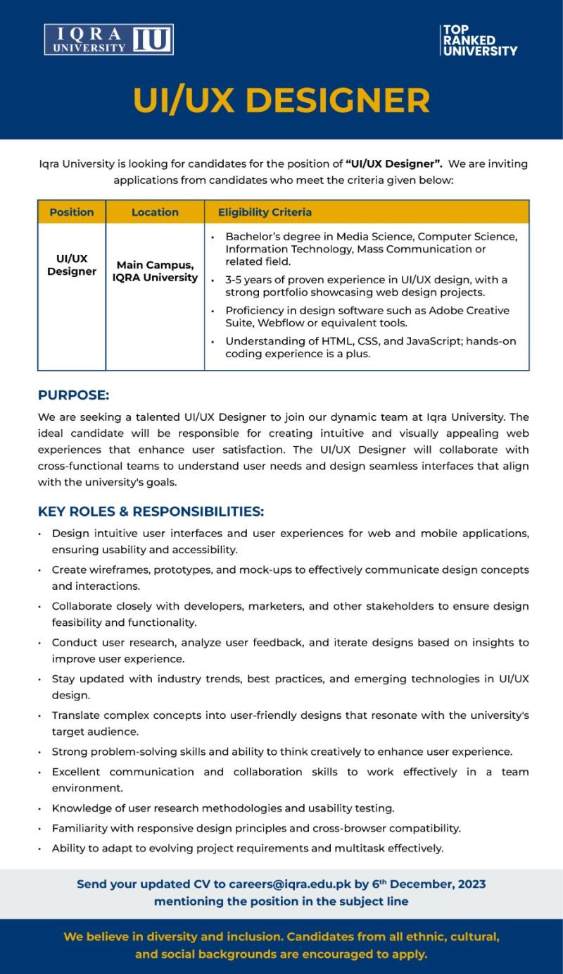 #Iqrauniversity #JobOpportunity #UI/UXDesigner #Maincampus