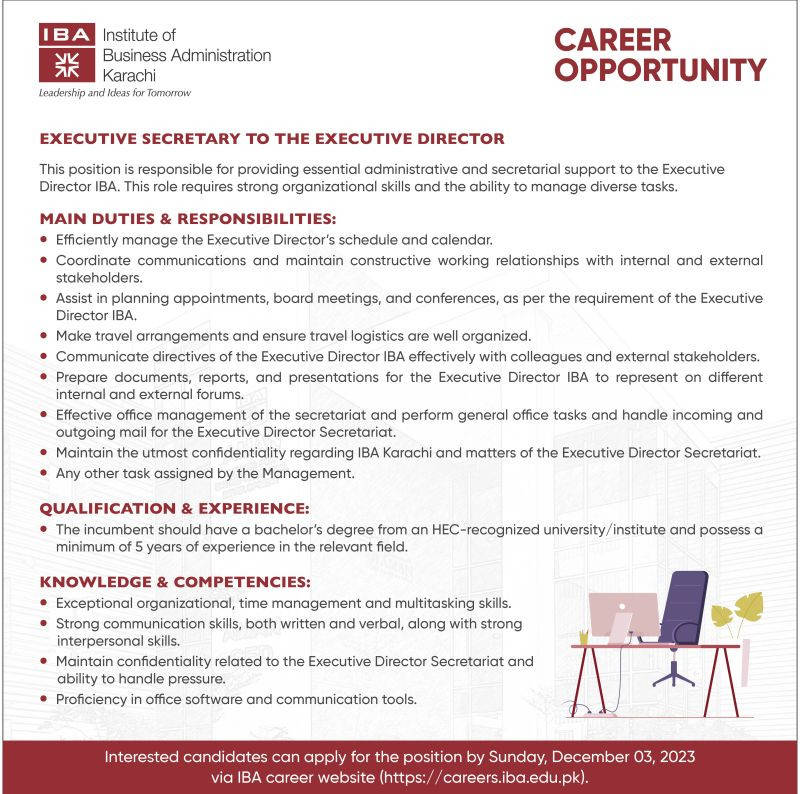 IBA Karachi is looking for a candidate for the position of 'Executive Secretary to the Executive Director’
