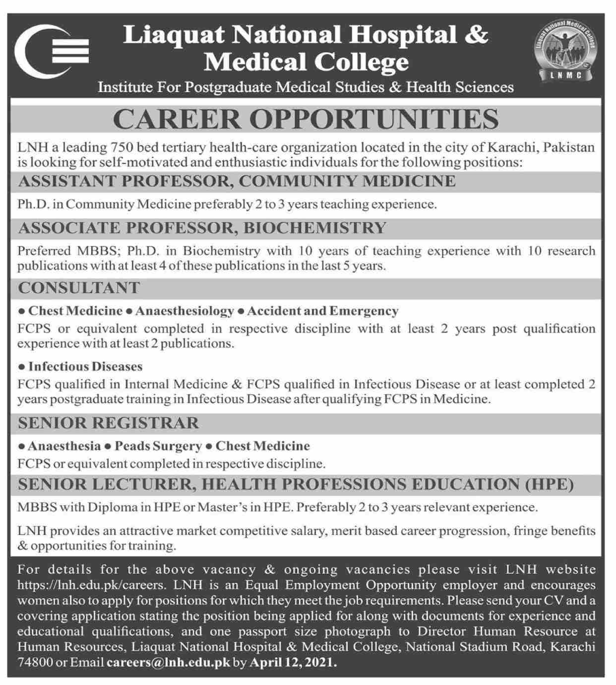 Liaquat National Medical College, Teaching/Facult & Management Jobs April 2021